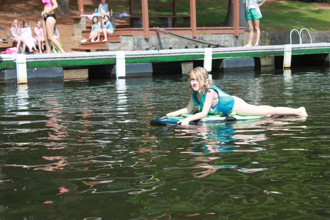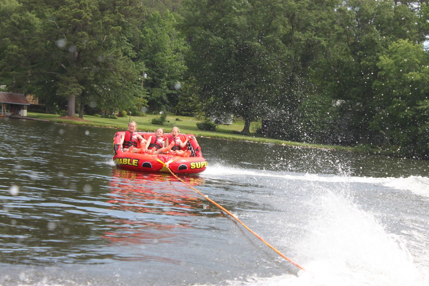 Today at the sunny Camp Mac lakes, the girls had a BLAST tubing on the Big Mable!!