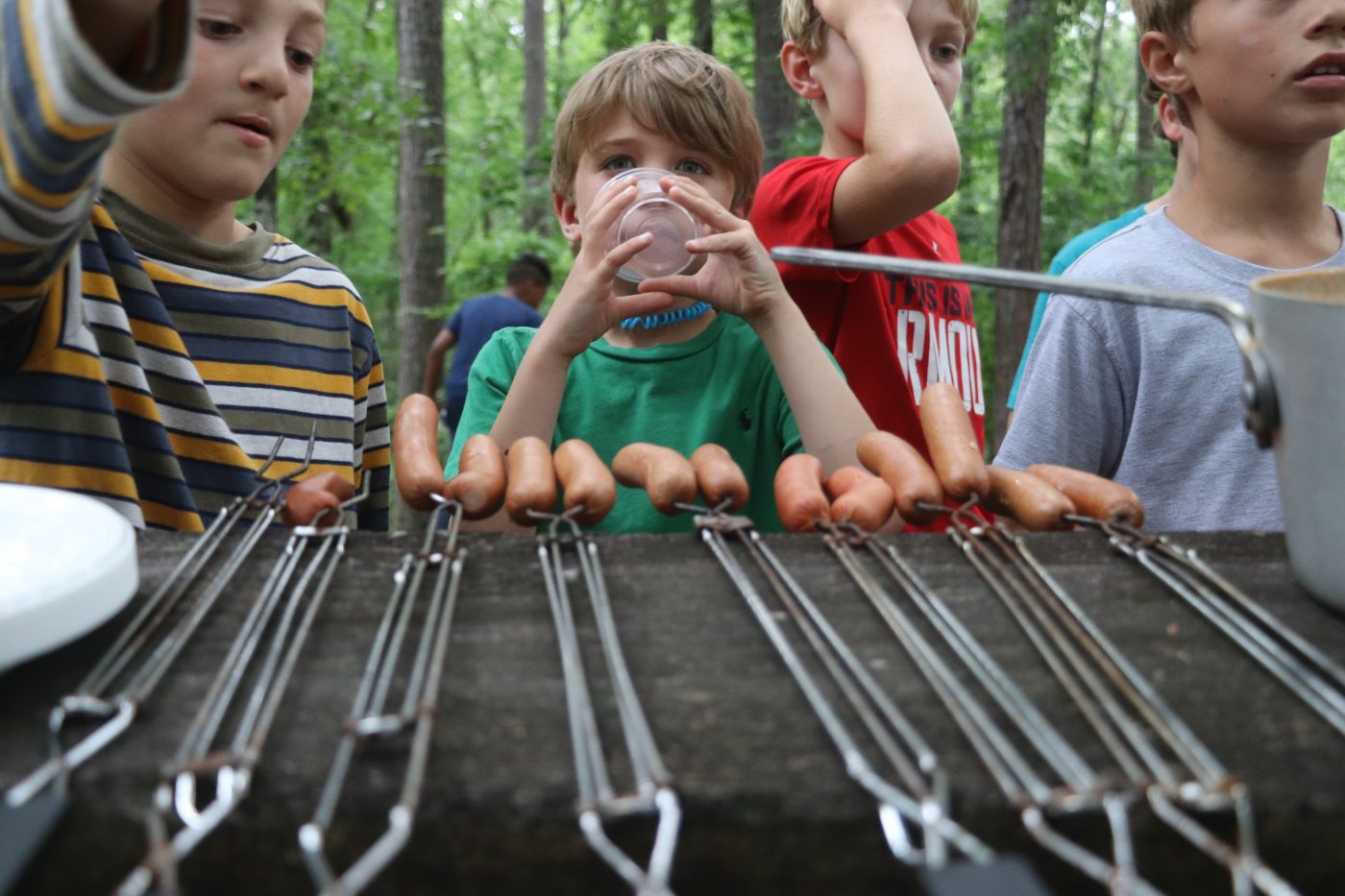 The campers went out and collected wood for their fire and roasted hotdogs and s'mores out in the woods with their cabins!
