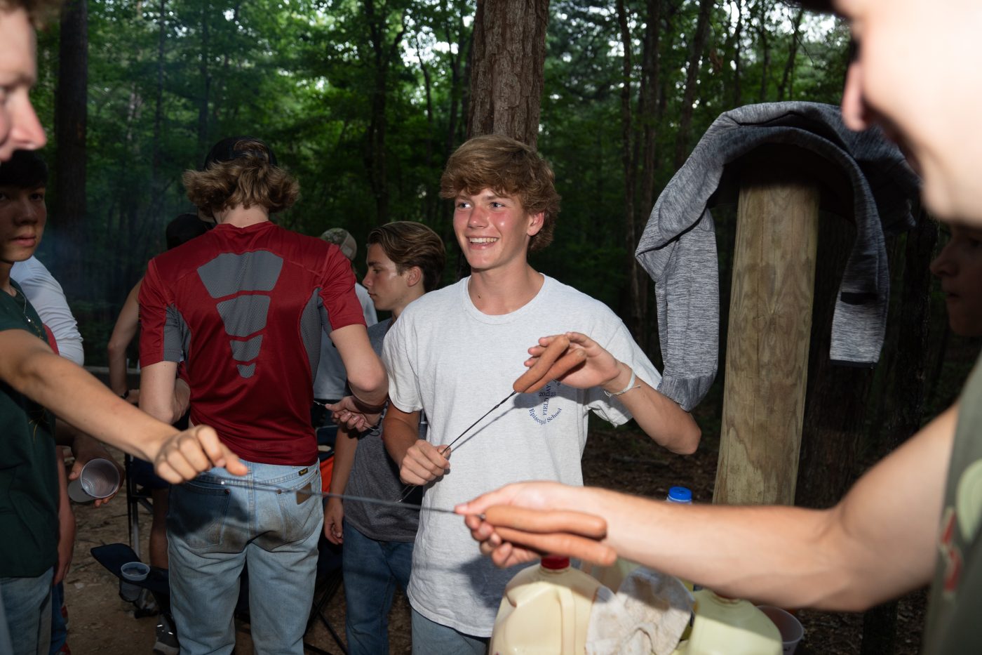 From the Dining Hall This morning, we had Sausage, Eggs, Grits, Toast, and Assorted Cereals.  For lunch, we had Hot Pockets with French Fries and a Salad Bar. For Dessert, we had Chocolate Chip Cookies. And to end the day, we had Hotdogs with Beans, Potato Chips, and S'Mores.
